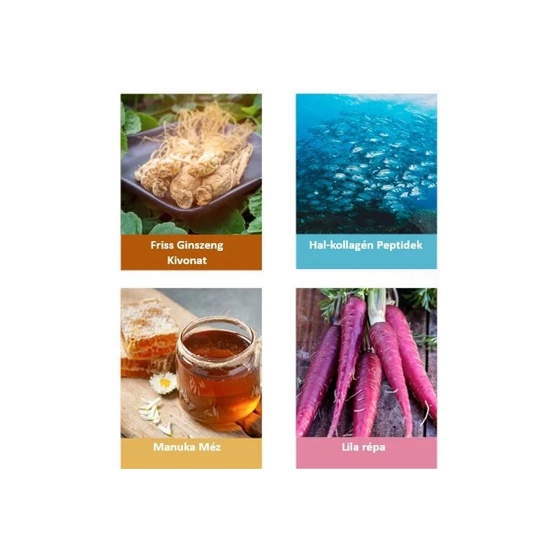 Friss ginzeng (Panax ginseng C.A. Mey.) gyökér folyékony kivonat (friss ginzeng kivonat 5:1 - 16.7%); víz; hal kollagén peptidek; almalé (Malus domestica Borkh.) koncentrátum; tápióka trehalóz* manióka gumóból (Manihot esculenta Crantz); savanyúságot szabályozó anyag: citromsav; sűrítő anyag: gumiarábikum; Manuka nektárméz**; lila sárgarépa (Daucus carota L.) és citromlé koncentrátum (Citrus limon (L.) Osbeck); emulgeálószer: pektinek, áfonya málna aroma; savanyúságot szabályozó anyag: almasav; emulgeálószer: napraforgó lecitin por; eper aroma; édesítőszer: stevia levelekből származó szteviol-glikozidok. (Stevia rebaudiana).