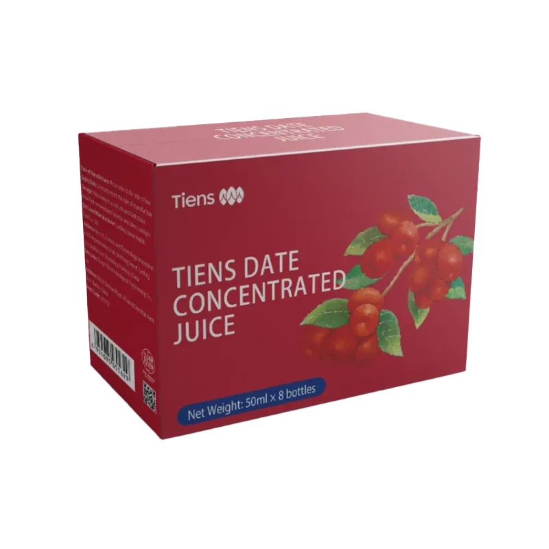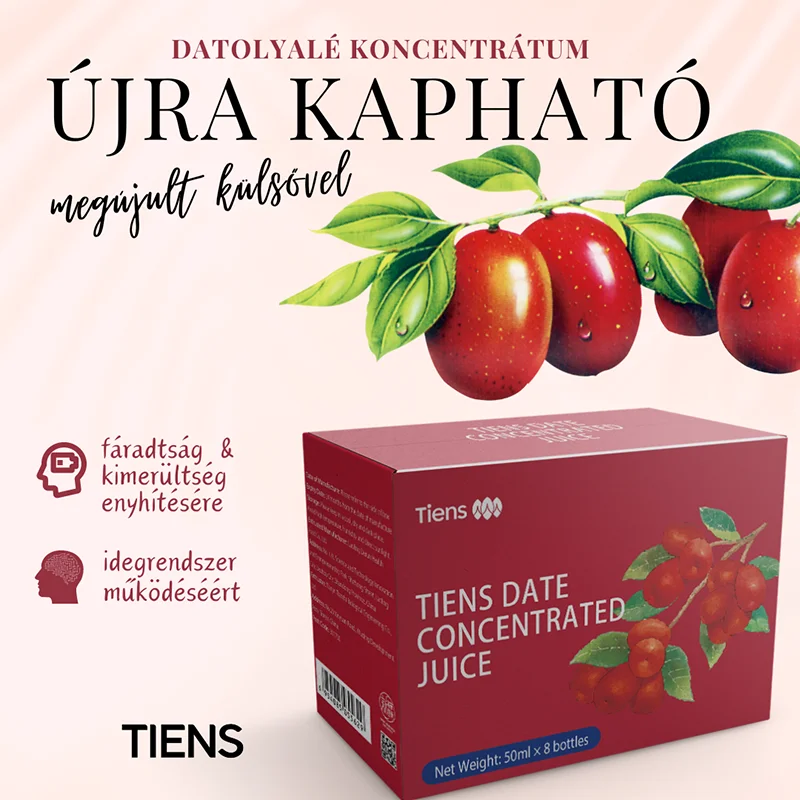 A TIENS Kínai datolyalé (jujuba) koncentrátum a legkiválóbb minőségű jujuba gyümölcs aranyselyem fajtájának kivonatából készül. A kínai datolya magas tápértékű, és vitaminokban, ásványi anyagokban gazdag. A C-vitamin hatékony antioxidáns, magas koncentrációjának köszönhetően pedig a gyümölcsöt gyakran „természetes C-vitaminként” is emlegetik. A kínai datolya csaknem 70–80-szor annyi C-vitamint tartalmaz, mint az alma. A gyümölcs rengeteg B-vitamint tartalmaz, amelyek serkentik az anyagcserét, csökkentik a fáradtságot és a kimerültséget, továbbá javítják az immun- és az idegrendszer működését. A kínai datolya ráadásul vasban, káliumban, magnéziumban és kalciumban gazdag. A jujuba a test megfelelő működéséhez elengedhetetlen 24 aminosavból 18-at tartalmaz. A gyümölcs leghasznosabb összetevője mégis a ciklikus adenozin-monofoszfát, röviden a cAMP. Ez a vegyület serkenti a sejtek közötti jelátvitelt, mert hatással van a sejtek közötti impulzusokra. A cAMP így számos más hatása mellett az idegrendszer kommunikációjához elengedhetetlen.